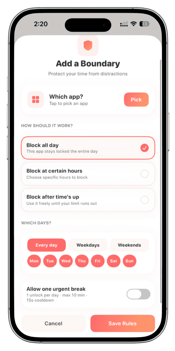 Limit distractions with flexible blocking—set all-day, timed, or scheduled blocks to fit your needs.