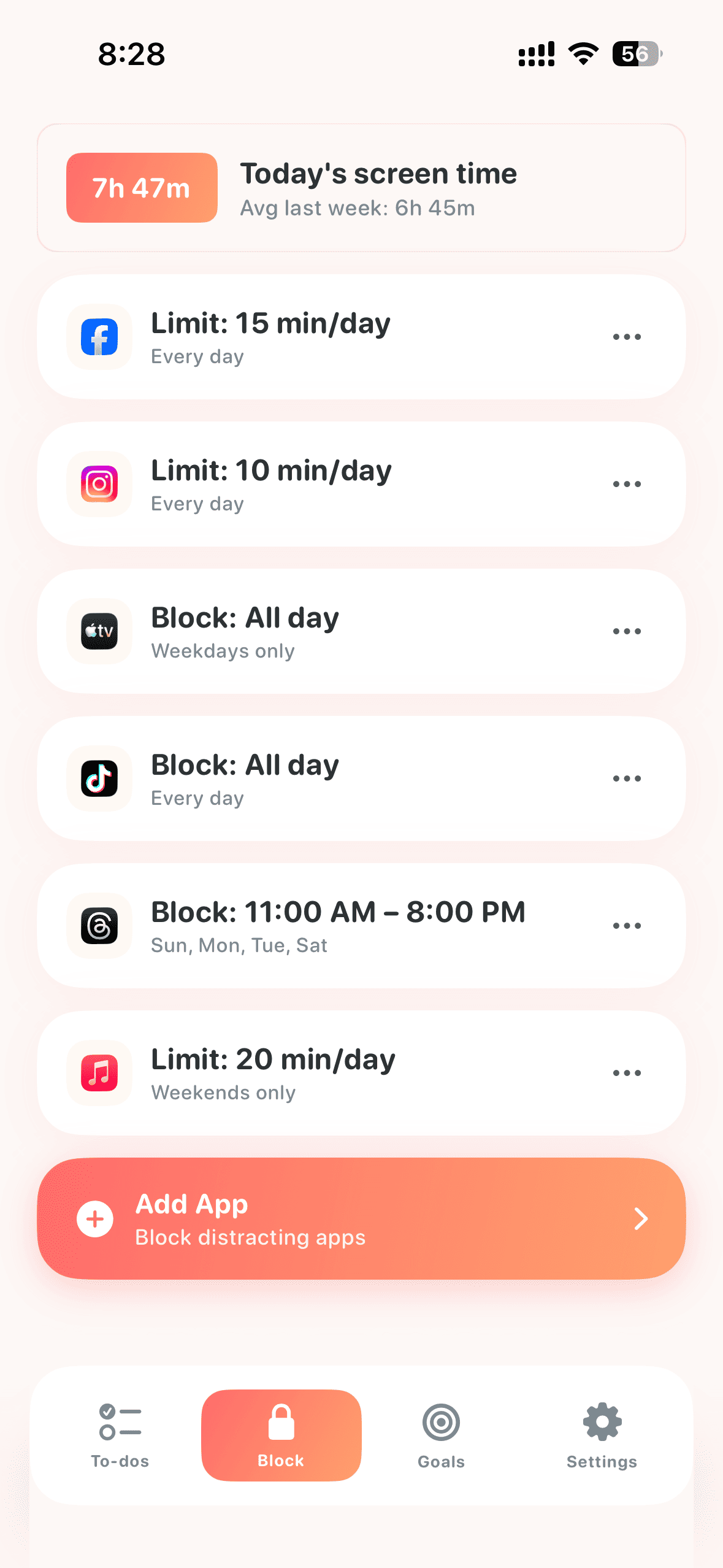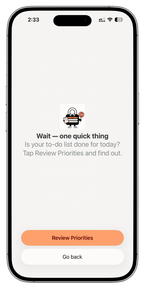 When you try to open a blocked app, we'll remind you about your priorities aka to-dos.